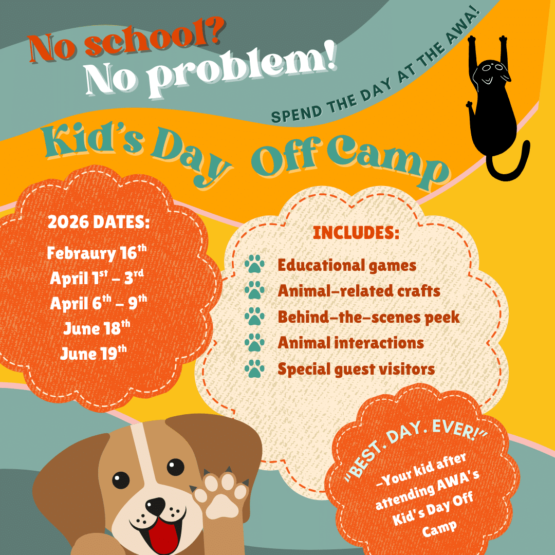 Camps are for ages 7-13 and run from 9:00-3:00 on various school holidays. We will play educational games, do crafts, and of course, see our animals. We often have special guest speakers and animals, and we always have fun!